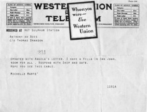 You and little Julius need a vacation. Leave Charlie with Angela and Maggie. Do not make the poor dog travel on the train again and come to Puerto Rico. We will return to Steamboat in June. Reply with ship and date. I cannot wait to see you and my son. Remember, the tragedy of love is not death or separation, the only tragedy of love is indifference. That does not seem to describe us, does it?